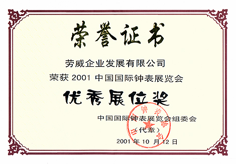 勞威企業發展有限公司於2001年10月參加在北京舉行的中國國際鐘錶展覽會中,獲得優秀展位獎。